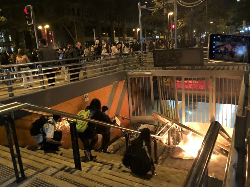 而小编那段时间正好在智利见证了这个历史时刻。从10月14日开始,高中学生们就自发地在部分地铁站组织抗议活动。依靠网络上的号召,18日当天已经有很多人参与到了抗议活动中, 同时矛盾继续升级,极端分子开始在大街上与警察交锋,并开始纵火、打砸地铁站,烧毁首都圣地亚哥市中心的电力大楼等等。随后几日,全国多处城市极端分子们都开始发动暴乱,抢劫商店银行、毁坏建筑物公共交通设施(公交车、地铁、地铁站)等等,严重影响了社会秩序和经济发展。