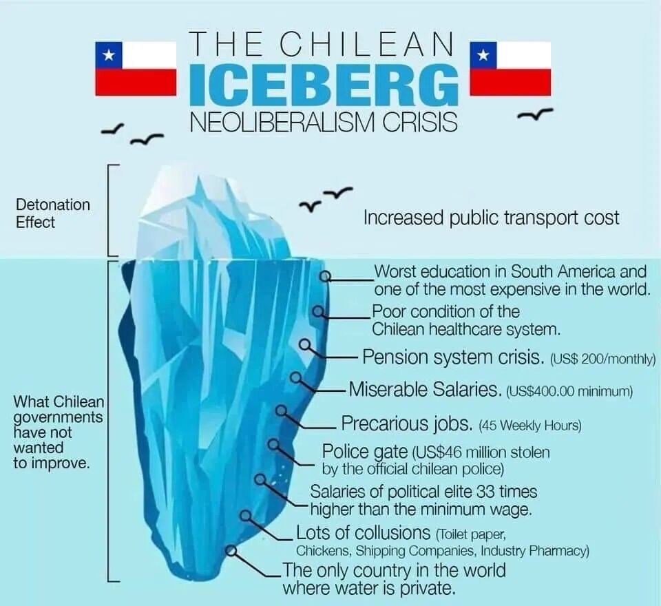 当然,地铁涨价只不过是导火索。智利的贫富差距很大,平均收入不高,光花在地铁上的消费就让低收入群体很是苦恼。加上近几年智利经济下行压力陡增,总统推进税法、劳动法和养老金改革牺牲了很多中下层百姓的利益;与此同时,智利高层腐败丑闻更是层出不穷,方方面面的压力使得智利人民一直都积累着对国家的不满。因此有网友用图片形象地说明了,地铁涨价只不过是智利问题的“冰山一角”。