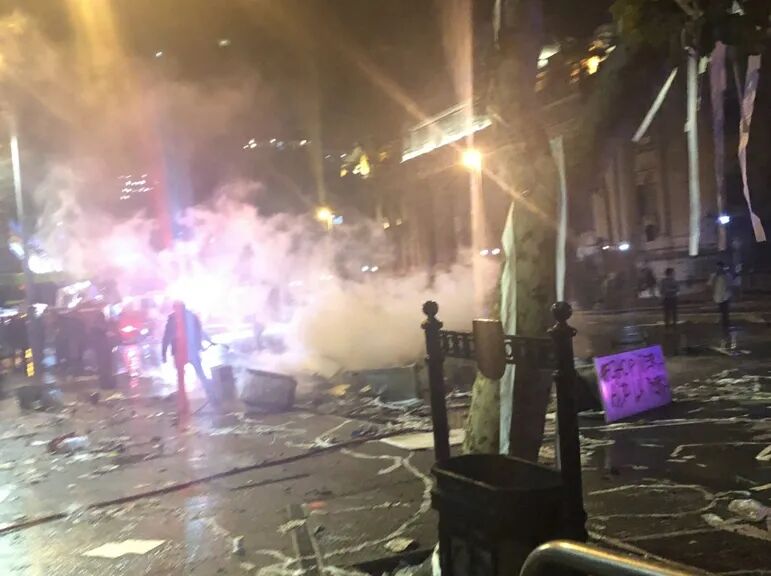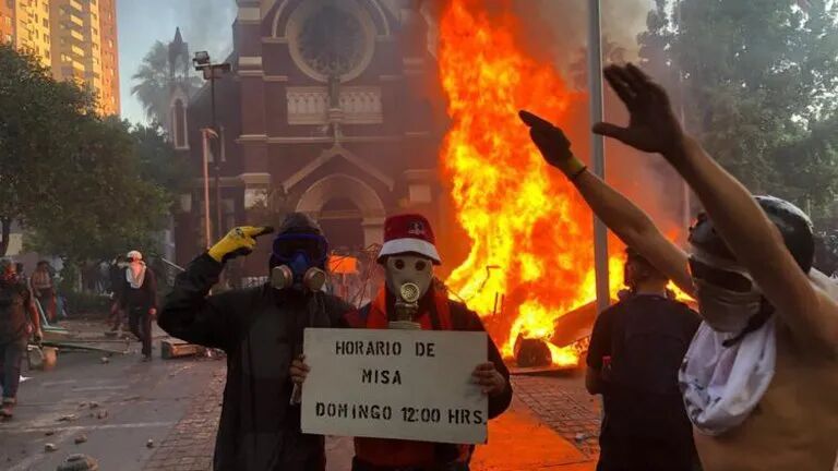 而且,他们还突破了警方的防线,肆意抢砸商店、纵火破坏,甚至还烧毁了两座教堂……在去年就因为频繁聚众抗议而变得面目全非的意大利广场,今年更是惨不忍睹。广场中心的Baquedano将军雕塑也受到了破坏。示威者们和警察的交锋一直持续到凌晨3点。