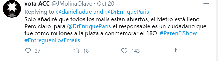 另一位网友说:“回复两位,我还想补充一点,现在所有的商业中心都是开着的,地铁也挤满了人,但是显然,@DrEnriqueParis所说的罪魁祸首只是指那些去意大利广场参加游行纪念10月18日的公民。(小编:阴阳怪气第一名就是你了朋友)”