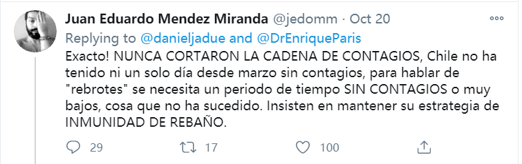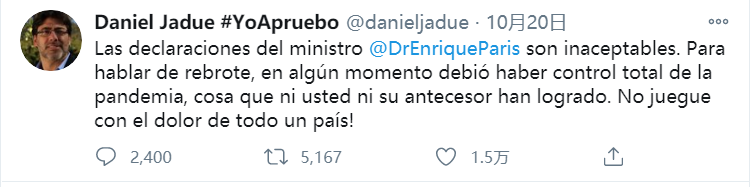 随后,Daniel犀利地回应说:“Enrique Paris部长的发言我无法接受。要说疫情复发,首先疫情得控制住了,才有复发一说。一直以来,现任及前任卫生部部长都没有使疫情得到过控制,别用国家的伤痛来做文章了!”