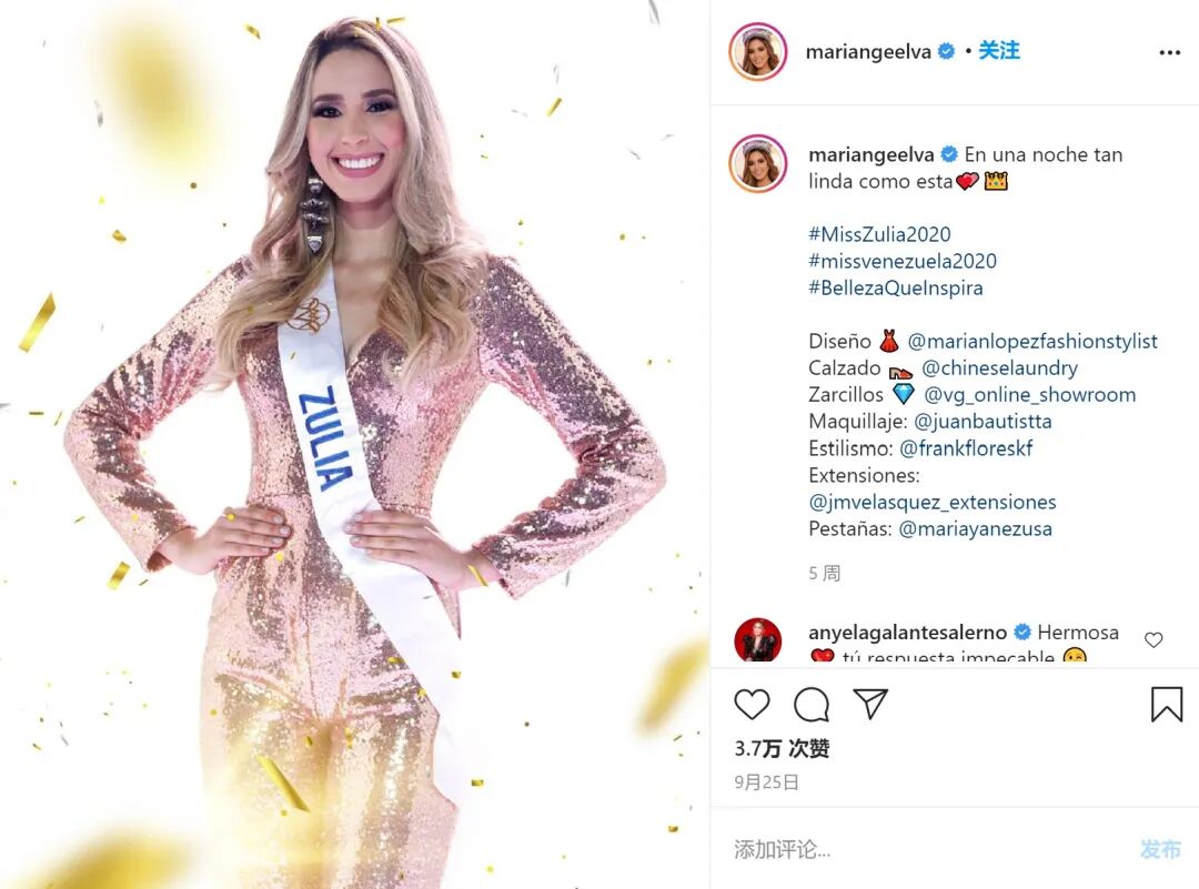 但就是这样,他们仍然启动了委内瑞拉小姐选美大赛——这个保持了67年之久的传统。主办方为在9月24日加拉加斯参赛的22位候选佳丽邀请了独立乐队、服装设计师和化妆师,她们身穿泳装、鸡尾酒会礼服和晚礼服走秀并决出了胜负。年仅24岁,大四心理专业的学生Mariangel Villasmil Arteaga荣获2020年度委内瑞拉小姐称号,并将代表委内瑞拉参加2020年环球小姐大赛。