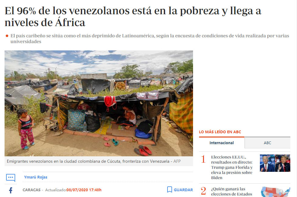 疫情蔓延下,委内瑞拉的“三把手”——全国制宪大会主席Diosdado Cabello确诊,首都加拉加斯封城。2013年以来,委内瑞拉深陷通货膨胀危机,经济崩坏,物价飞涨。据IMF预计,疫情使委内瑞拉的情况雪上加霜,失业率可能会增加到50.5%,甚至据《ABC报》的报道,该国有96%的人口都处于贫困之中,甚至与非洲的水平相差无几。