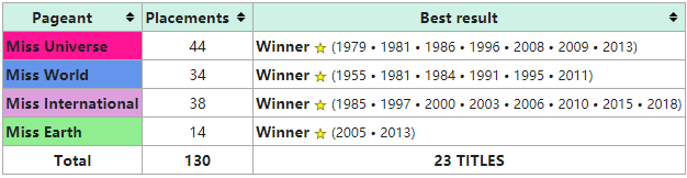 委内瑞拉是最负盛名的美女之国,这个人口不到3200万的国家是世界上诞生选美冠军最多的地方:这里曾出过6位世界小姐(Miss World)冠军、7位环球小姐(Miss Universe)冠军和8位国际小姐(Miss International)冠军,甚至还有两位地球小姐(Miss Earth)冠军。说委内瑞拉是“选美冠军的工厂”都不为过。