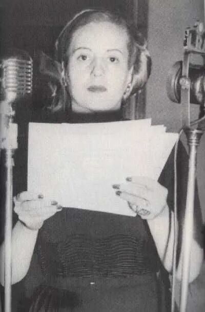 “在那些来往于我办公室的人中,有一位年轻而瘦弱的女士,但是声音坚定,金色的长发垂下来,眼神中闪烁着光芒,她说她叫Eva Duarte,是一位播音员和演员,她也希望能为受灾的群众做些什么。”胡安·贝隆后来回忆道。