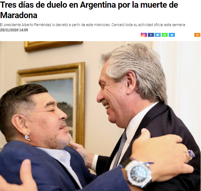 其中也不乏政界人士:阿根廷总统Alberto Fernández和西班牙首相Pedro Sánchez都表达了对他的悼念;为此,阿根廷也将举行为期三天的举国哀悼。