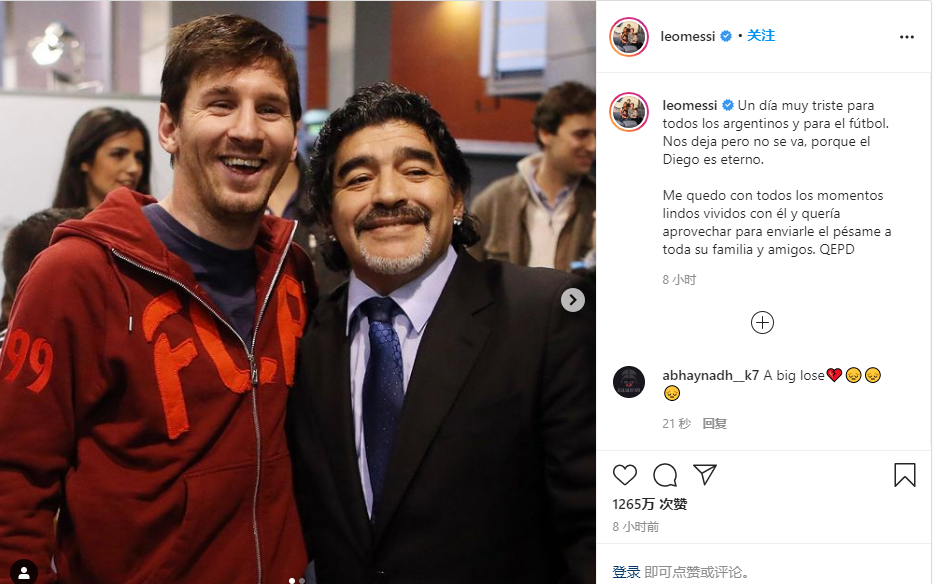 梅西:“对于全体阿根廷人和整个足球界来说都是悲痛的一天。他留下了我们但未曾离去,因为迭戈永存……”