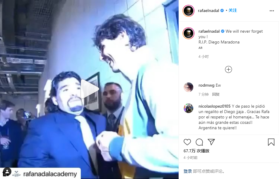 纳达尔:“我们永远都不会忘记你,愿安息,马拉多纳。”