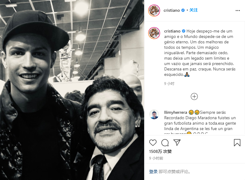C罗:“今天我告别了一个朋友,世界告别了一个永远的天才人物。他是有史以来最棒的,是无与伦比的魔术师,他离开得太早了,留下了无尽的遗产和无法填补的空白……”