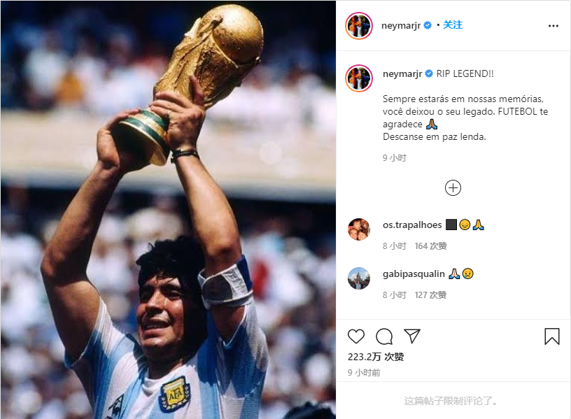 内马尔:“安息吧传奇!您和您留下的遗产将永远在我们的记忆中。足球界感谢有你。”