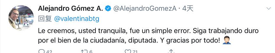 其中有不少的网友相信她并不是故意要缺席这次的会议,可以原谅。就如这位网友在Valentina的Twitter下的留言:“我们相信您,您放心好了,这只是一个小失误。您一直都为我们这些市民谋福利,感谢您做的一切!”