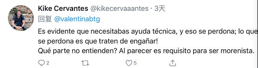 还有一位网友说的十分地中肯:“很明显你需要技术支持,而且你为此道歉了,但是你需要道歉的原因其实是骗人!还有哪里不懂吗?看来作为一个Morena党员这是最基本的要求。”