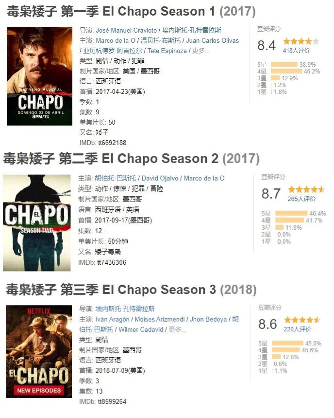 网飞当然也不会错过这个大好素材。这位毒枭的故事也被拍成了电视剧,名字就叫《毒枭矮子》(El Chapo)——据说这是因为他本人身高也才168厘米。电视剧拍了三季,目前豆瓣评分都还不错。