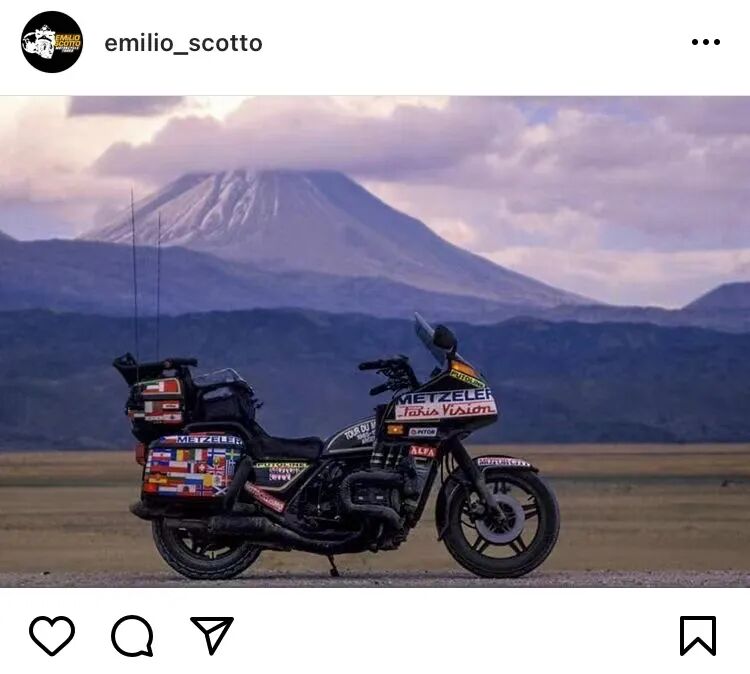 尽管有了环游世界的想法,Emilio却一直没考虑如何实现它。直到有一天,他陪朋友来到了一个摩托车的经销处,被一张黑色的本田金翼摩托车的照片所吸引,上边写着“两个轮子之上,整个世界都属于你”。