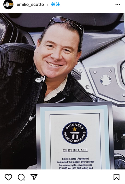 Emilio Scotto曾是一名医疗顾问,过着平淡无奇的生活。然而,就在某天,他突然下定决心去旅行。他想要环游世界来实现童年的梦想。于是,他骑着摩托车,完成了两次环球旅行,历时10年2个月零19天。而他的摩托车现在正在距离拉斯维加斯45公里处的美国内华达州劳欣河畔度假村酒店的博物馆(Museo del Riverside Resort and Casino Hotel)里面展出。