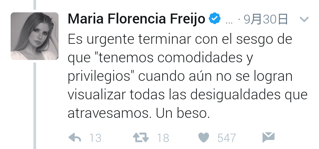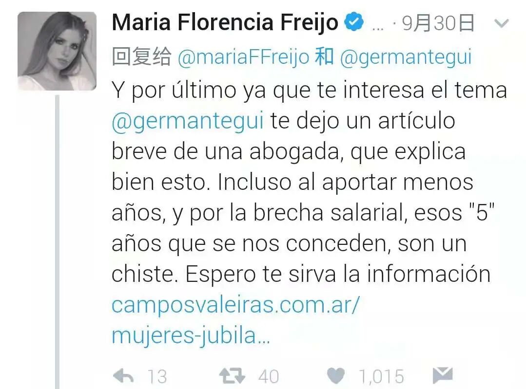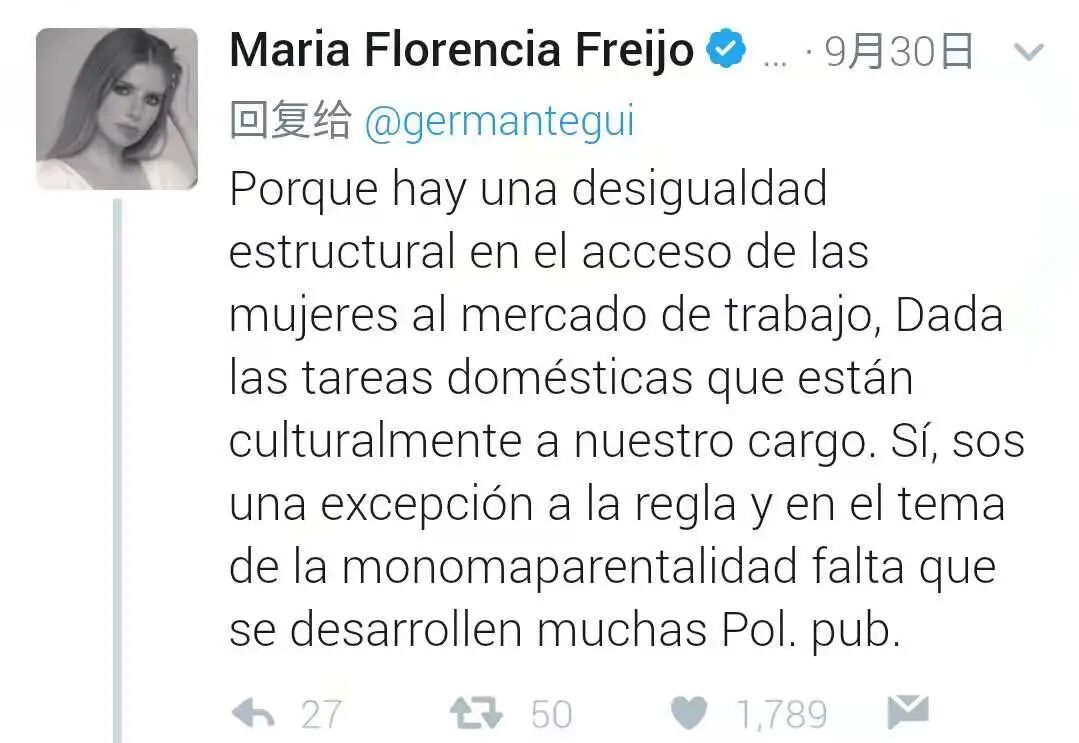 例如作家Florencia Freijó就给出了一连串的“教学式评论”:“因为女性在职场就业机会方面面临着结构性的不平等,女性在文化传统上被迫承担了家务劳动。是的,你是一个例外,公共政策在单亲家庭的问题上还亟待发展。”