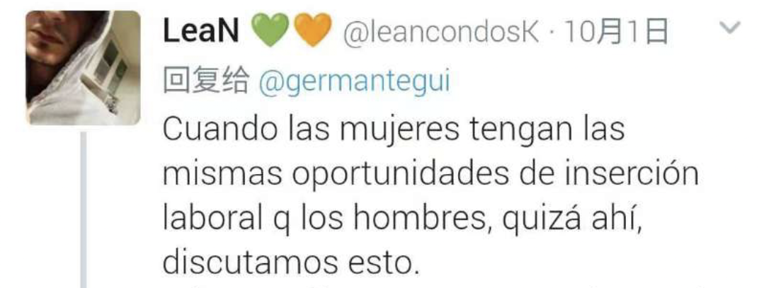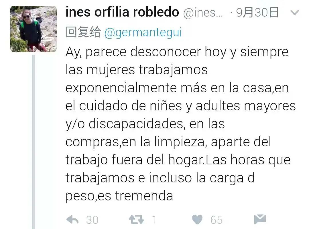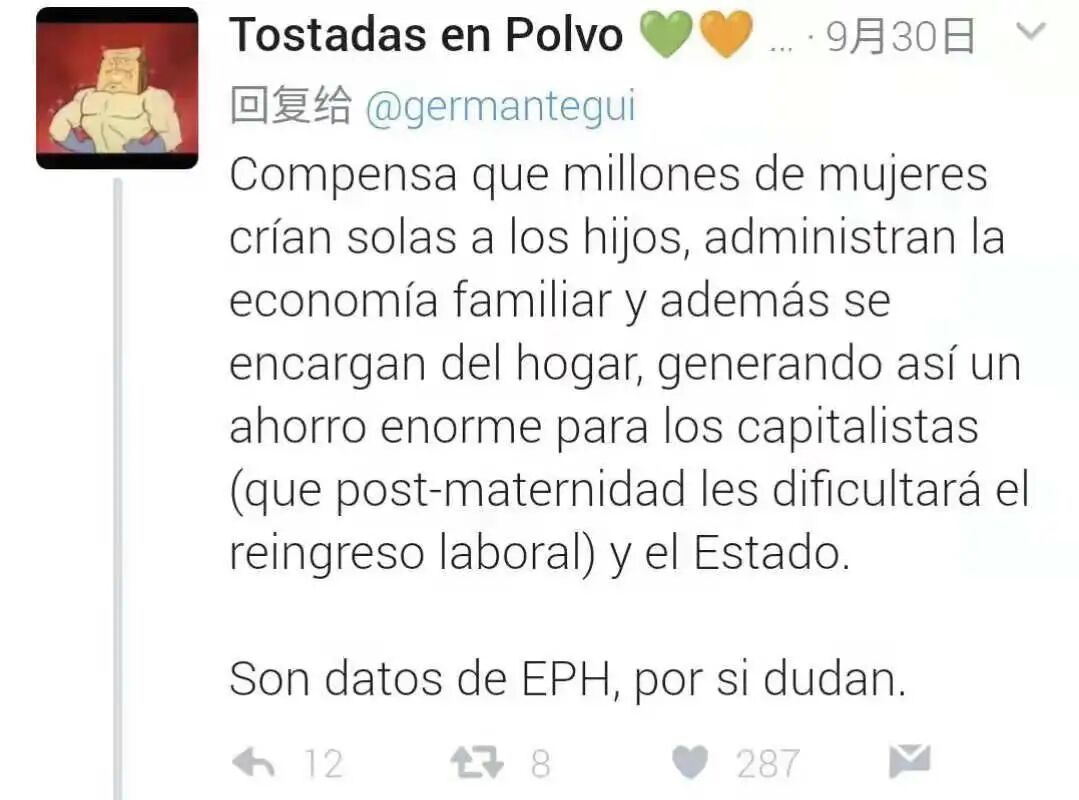 网友立刻对此作出了回应:“同样有数百万女人独自抚养孩子,赚钱养家,承担家务,为资本家(女人在生育后很难重返工作岗位)和国家节省了巨大的开支。以防你提出质疑,这是EPH(la Encuesta Permanente de Hogares,阿根廷常住家庭调查)的数据。”