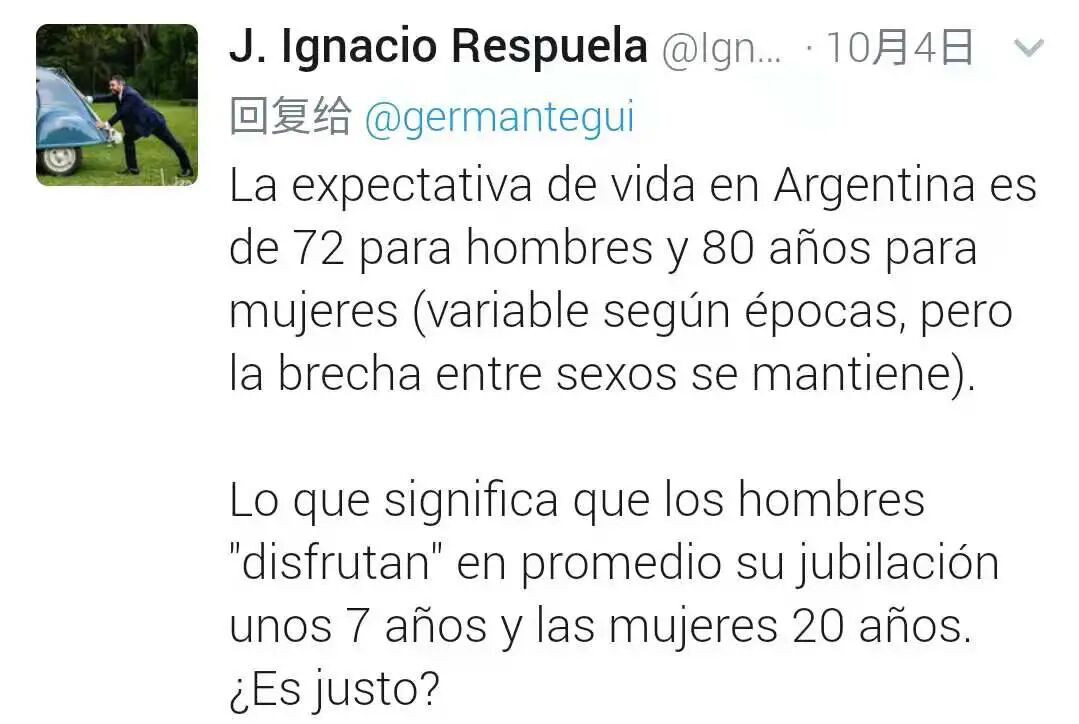 这位网友也表示:“阿根廷男性的平均寿命是72岁,女性是80岁(这一数据随着时代变化,但男女之间一直保持着差异)。这意味着男人平均能够‘享受’的退休时间大约只有7年,而女人则是20年。这公平吗?”