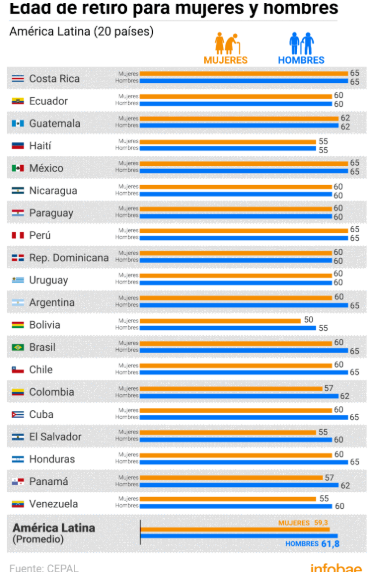 Alberto Arenas, asesor regional de la Comisión Económica para América Latina y el Caribe (Cepal) y ex ministro de Hacienda de Chile había explicado el año pasado: “No en todos los países los hombres y mujeres se jubilan a edades distintas. En la región, en casi la mitad de los países se jubilan a la misma edad. La determinación de edades diferentes surgió con la creación de los primeros sistemas de pensiones en América Latina, que fueron pioneros a principios del siglo XX. En ese momento, la visión que se tenía era que el retiro tenía que ocurrir al mismo tiempo para los matrimonios y entonces, en los años 20 o 30 del siglo pasado, en las relaciones de parejas los hombres eran casi siempre mayores que las mujeres. Por lo tanto, al poner edades diferentes se generaba es que se jubilaban al mismo tiempo”.