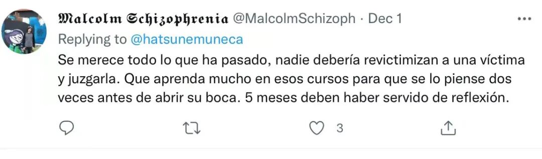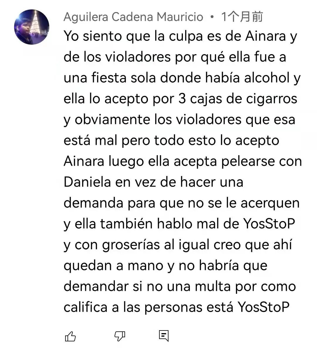甚至有人觉得问题出在Ainara身上:“我觉得错在Ainara和那些侵犯她的人,因为她为了三包烟就愿意独自来到一个有酒喝的派对上。显然侵犯者是有错的,但是Ainara自己都是接受的。她后来又愿意和Daniela打打闹闹,而不是让他们别靠近自己。Ainara也讲过YosStoP的坏话啊,也是一样的恶言相对,我觉得两人没啥区别。其实也不必起诉YosStoP,给她评判别人的那种做法罚个款就行了。”