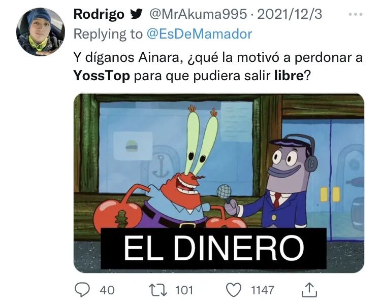 “跟我们说说,Ainara,你是出于什么动机原谅了YossTop并且让她自由出狱的呢?(为了钱。jpg)”
