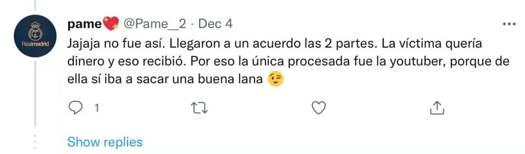还有人调侃说这个结果不过是又一次各取所需的交易罢了:“哈哈哈不是这样的。两方达成了一份协议。受害者想要得到点钱,Yoseline这方也接受了。所以唯一一个受审的是这个油管博主,因为确实有人从她身上拿了不少好处。”