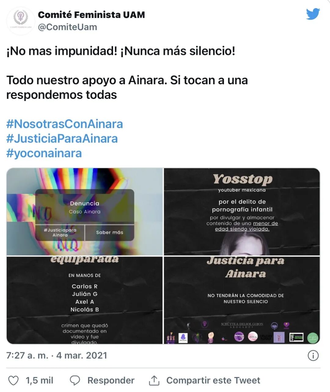 身为百万博主,Yoseline的言论很快传播了开来,不仅引起了轰动,而且给Ainara带来了二次伤害。对此,一些女权主义团体站出来为Ainara发声: