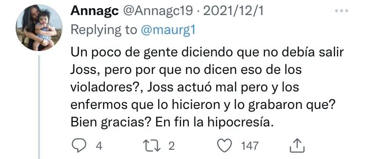 有人表示大家应该把重点放在那些实施侵犯的人身上:“有少部分人说Joss(指Yoseline)不应该出狱,但为什么你们不对那些侵犯者这样说呢?Joss做错了,但那些实施侵犯并且录视频的疯子又如何呢?对他们说‘好的谢谢’吗?到头来还是伪善。”