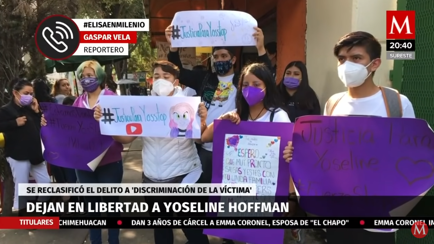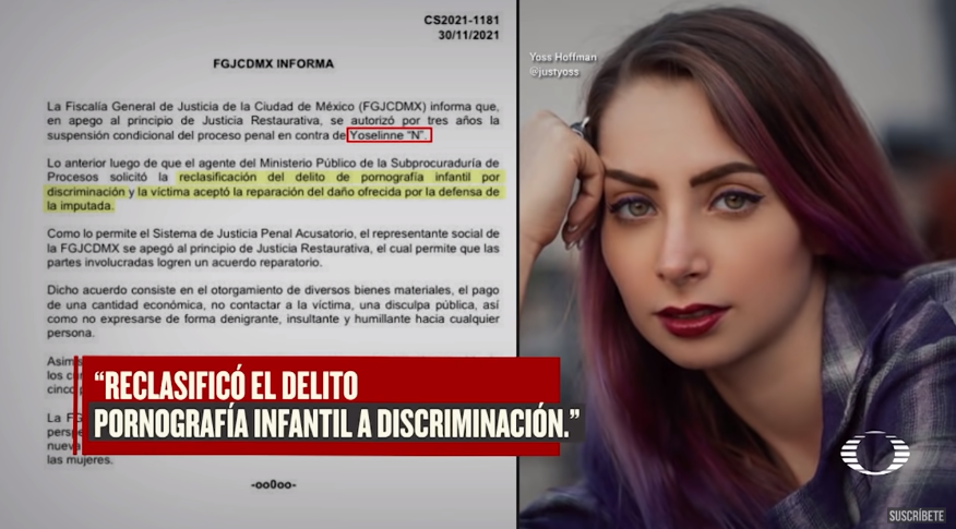 Según detallaron las autoridades, en "apego al principio de justicia restaurativa", un representante social del Ministerio Público solicitó "la reclasificación del delito de pornografía infantil", con el que fue imputada originalmente, "por el de discriminación", lo que permitió a las partes involucradas establecer un acuerdo, y la eventual liberación de Hoffman.