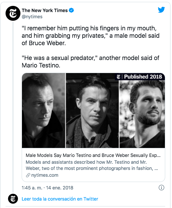 hhttps://www.elmundo.es/loc/celebrities/2018/01/14/5a5ba76b22601dd6138b45f4.htmlhttps://fahrenheitmagazine.com/life-style/luxury/galea-la-mezcla-ente-lo-tradicional-y-lo-contemporaneohttps://elpais.com/elpais/2018/02/14/gente/1518621515_678758.htmlhttps://www.vogue.es/moda/modapedia/fotografos/mario-testino/214https://www.dailymail.co.uk/news/article-5318543/Mario-Testinos-secret-British-wife-knew-gay.htmhttps://www.harpersbazaar.com/es/moda/noticias-moda/a15158659/mario-testino-bruce-weber-agresion-sexual/https://www.rtve.es/noticias/20180114/modelos-masculinos-acusan-acoso-fotografos-mario-testino-bruce-weber/1659700.shtml