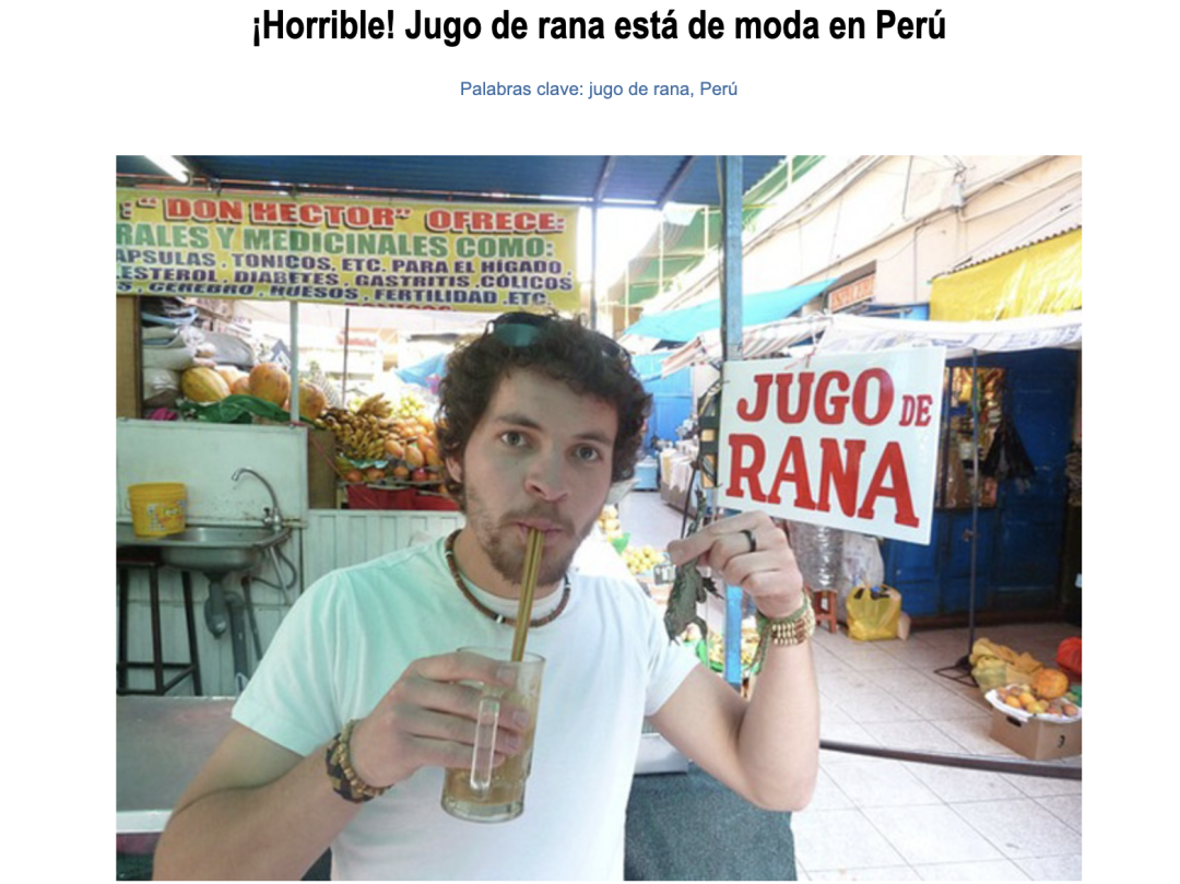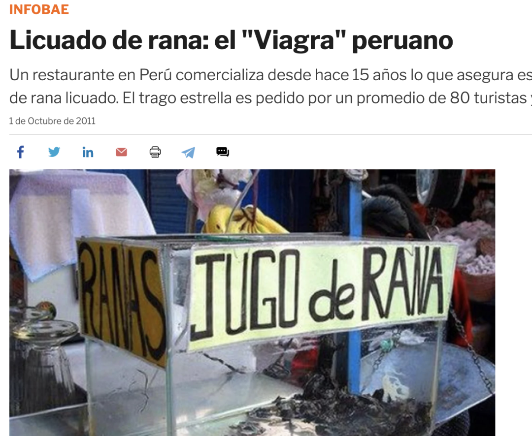 https://www.infobae.com/2011/10/01/608795-licuado-rana-el-viagra-peruano/https://mundo.sputniknews.com/20211118/licuado-de-rana-gigante-el-milagroso-elixir-que-amenaza-al-anfibio-del-lago-titicaca-1118371417.html#:~:text=Jugo%20de%20rana%20%22El%20jugo%20de%20ranas%20sali%C3%B3,ese%20ingrediente%20lo%20cura%20todo%20pr%C3%A1cticamente%22%2C%20relat%C3%B3%20Mu%C3%B1oz.https://peru.wcs.org/es-es/WCS-Peru/Noticias/articleType/ArticleView/articleId/16913/Jugo-de-rana-un-licuado-de-parasitos-y-bacterias-que-podria-causar-enfermedades-en-vez-de-curarlas.aspx
