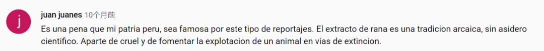 “我的祖国秘鲁以这类报道而闻名,真是太令人遗憾了。青蛙提取物是一种古老的传统,而且没有什么科学依据。除了残忍以及鼓励剥削濒临灭绝的动物以外没啥了。”