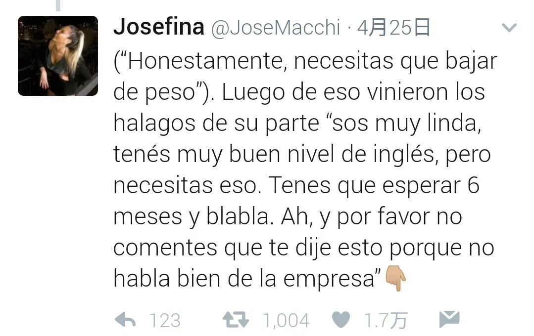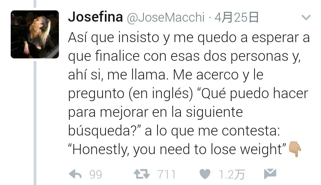 当她走到招聘人员身边,并询问她今后可以怎样改进自己的业务时,Josefina得到了一个令她震惊的答复。对方回答说:“说实话,你需要减肥。”之后她开始称赞Josefina:“你非常漂亮,英语也很好,但你需要减肥。你必须再等6个月……。哦,请不要到处宣扬我对你说的这些话,因为这对公司不好”,Josefina在推特上说。