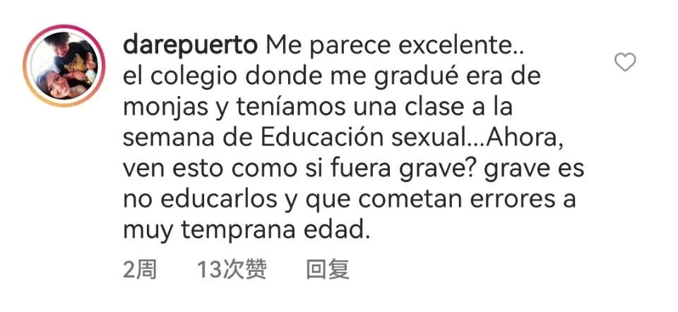 “我觉得真是太棒了……我毕业的学校是修女开的,还每周都会有性教育课呢……结果现在,这就被人说太过了?过分的是根本不给他们这样的教育,让孩子们在太早的年龄就犯了错。”