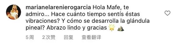 “Mafe你好,我好崇拜你……你从什么时候开始能够感受到这种频率的震动呢?如何激活自己的松果体?(一种大脑腺体,有调节神经和生殖系统的功能)抱抱你,感谢”