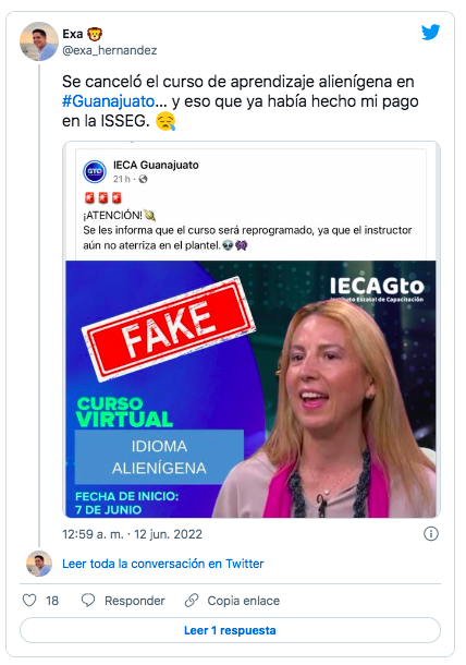 En otra publicación, el IECA informaba que “el curso sobre el idioma alienígena será reprogramado, ya que “el instructor aún no aterriza en el plantel”, alargando la broma lo más posible.紧接着在另一个帖子中,IECA又称“外星语课程将有待重新安排时间,因为‘教师尚未登陆校园’”,此举又把这个梗的存活时间延长了很久。网友很配合地表示:“课程居然被取消了!宝宝我可是学费都交了昂。”