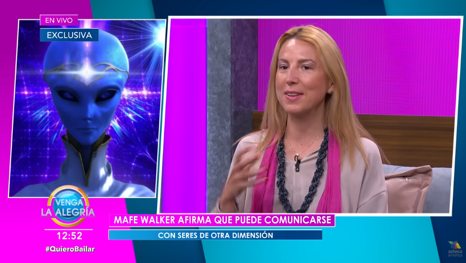 在墨西哥电视的一个台晨间节目《Venga la Alegría》上(好家伙,墨西哥人民一大早就玩这么大么?),Walker女士解释了她如何设法获得与外星人交流的能力,并揭示了这些生物的老家以及它们与地球居民接触的目的。Walker aclaró que ella se ha comunicado con "seres estelares", los cuales provienen de otras constelaciones que están en dimensiones "más altas que la Tierra".Mafe Walker承认,她已经与来自其他星球的“恒星生物”进行了交流,这些星球的维度“高于地球”。La mujer también indicó que estos seres son unas entidades "divinas" que desean estar en comunicación con los seres humanos, porque tienen un "inmenso amor" para entregar. De igual manera, aclaró que estas entidades carecen de un cuerpo físico pues ellos son vibraciones de energía pura.这位女士还表示,这些生物是一些“神圣”的存在,它们渴望与人类交流,因为它们怀有“巨大的爱意”并希望可以传递这份爱。同时她还进一步解释说,这些“存在”缺乏一个实质性的身体,因为它们只能靠纯粹能量的振动而存在。