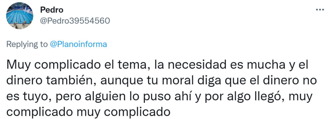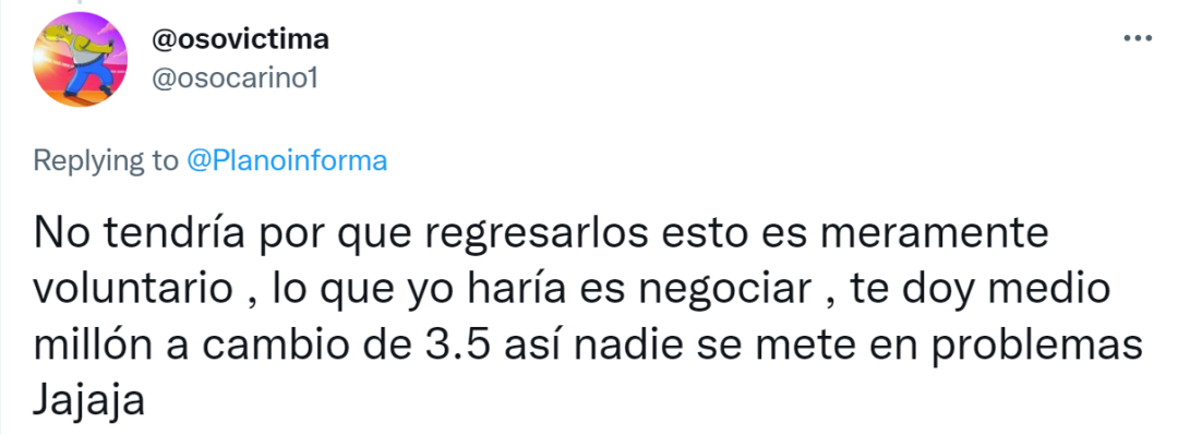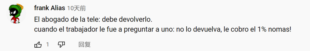 Sin embargo, hasta el momento la empresa no ha logrado que un juez falle a su favor, ni que el ex empleado regrese el dinero.然而,到目前为止,该公司未能让法官作出有利于自己的裁决,也没能让前雇员退还这笔钱。面对这一“天降巨款”的轶事,网友们自然也是众说纷纭。有人觉得不还也没事:“没有必要,因为还钱这事就是自愿的,要我的话就来谈判,比如我把50万(这位网友应该是按墨西哥比索算的,满打满算400万)还你,另外350万就归我,这样谁都不会惹麻烦,哈哈哈”