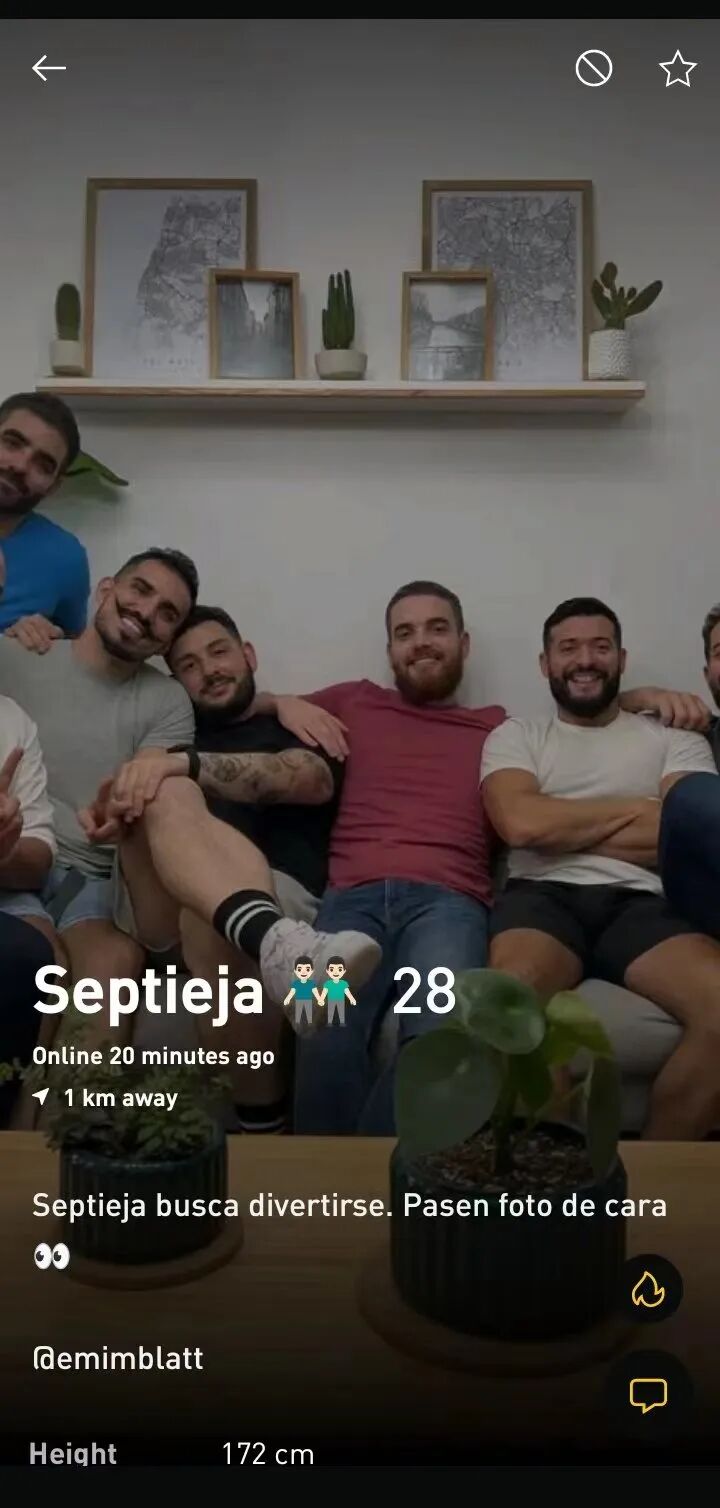 Julián reconoce estar algo sobrepasado. "Se ha generado demasiada repercusión", admite este peluquero bonaerense a Yasss desde el otro lado del Atlántico. Hace unos días, su 'grupo' y él publicaron una foto en Grindr - la principal aplicación de citas destinada a hombres gays y bisexuales - buscando "diversión". Julián承认事情有些超乎想象。“反响太热烈了”,这位来自大西洋彼岸的布宜诺斯艾利斯理发师说道。几天前,他和他的“团体”在Grindr——一款针对同性恋和双性恋男子的主流约会软件——上发布了一张照片,说要寻找“一些乐子”。Lo curioso es que los siete se presentaban como una 'septieja'; es decir, siete personas que mantienen una relación sentimental entre sí. Todos ellos, la mayoría entre 25 y 35 años, salían en la imagen sonrientes y muy unidos. Alguien capturó el anuncio, comenzó a propagarlo por redes sociales y su historia se ha convertido ahora en viral.有趣的是,他们七个人以“七人行”的方式亮相;也就是说,七个人之间相互保持着恋爱关系。他们大多数在25至35岁之间,照片中的所有人都面带微笑,非常亲密。有人给这个帖子截了图,开始在社交媒体上传播,如今他们的故事变得非常火爆。