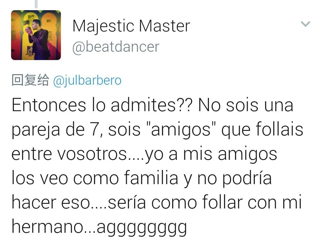 有网友对Julián口中的“朋友”定义提出了质疑:“所以你承认了吗?你们不是七人情侣,你们是会上床的‘朋友’……对我来说朋友就像家人一样,我不能这样做……这就像和我的兄弟那啥一样……啊啊啊啊”