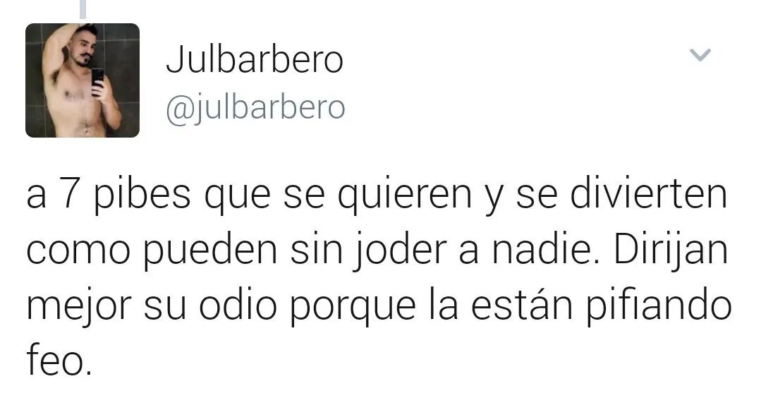 很多网友不理解这种“七人行”的恋爱模式,甚至出言攻击,Julián则为这些言论感到遗憾:"Me siento un poco triste por los que nos odian por no entender cómo nos relacionamos. Hay gente matándose en otros países, políticos robando, pedófilos haciendo de las suyas y se ponen a 'bardear' a siete pibes que se quieren y se divierten como pueden sin joder a nadie. Dirijan mejor su odio porque la están pifiando feo", explicaba. Muchos criticaban a los siete hombres por declararse como septieja cuando, según ellos, sólo practicaban orgías o sexo en grupo y no existía una vinculación afectiva entre sí.“我为那些讨厌我们的人感到有点难过,因为他们不理解我们是如何交往的。有人在别的国家互相残杀,有的政客窃取财富,有的恋/童癖为所欲为,网友却开始‘厌恶’七个尽其所能相爱、享受自我,而没有伤害任何人的小伙子。你最好把你的仇恨转移到别处,因为这样的嘴脸很丑陋”,他说道。许多人批评这七个男人,因为他们宣称自己是“七人行”,但人们认为他们只是在聚众狂欢或进行集体性行为,不存在感情。