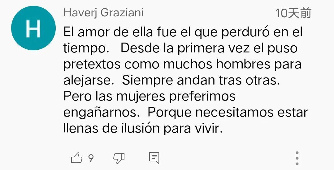“她的爱超越了时间。然而从第一次开始,他就像许多男人一样找借口离开。他们总是追着别的女人跑。但我们女人更喜欢欺骗自己。因为我们需要满怀幻想才能生活。”