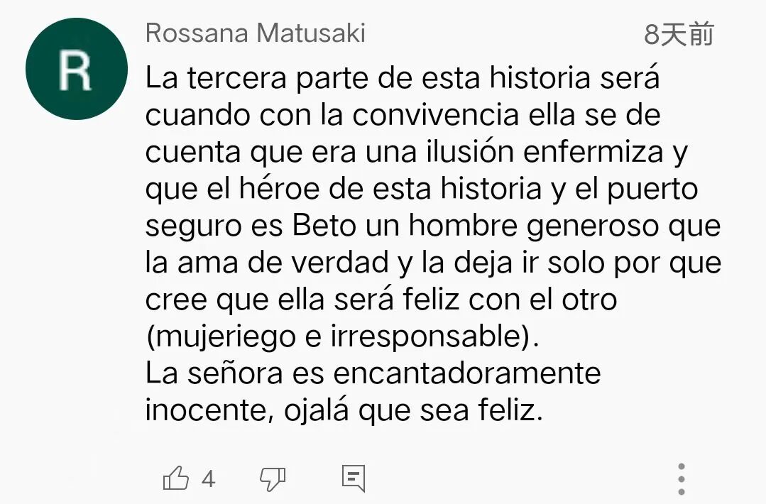 “这个故事的第三部分将会是:在两人一起生活后,她意识到这只是一种病态的幻想,而这个故事中的英雄人物和避风港是Beto(Silvia的前任),一个真正爱她的慷慨的男人,让她离开只是因为他相信她和另一个人(好色之徒和不负责任的人)在一起会幸福。这位女士有种迷人的天真,希望她幸福。”