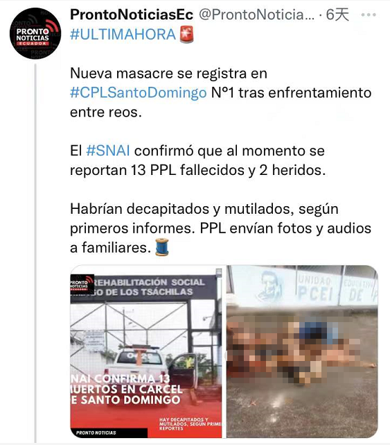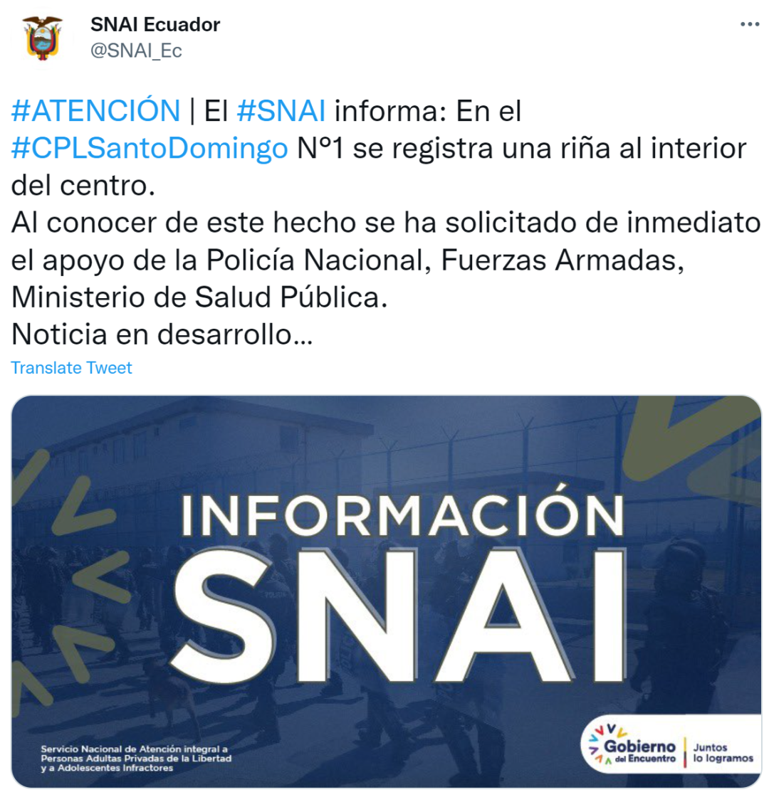 "Con el apoyo de la Policía y las Fuerzas Armadas se retoma el control del Centro de Privación de Libertad Santo Domingo Nº1. Lamentablemente, personal del centro reporta al momento 13 PPL (personas privadas de libertad) fallecidos y 2 heridos", precisó el SNAI en un mensaje de Twitter.“在警察和武装部队的支持下,圣多明各第一监狱的控制权被重新夺回。然而不幸的是,监狱中心工作人员目前报告共有13名服刑人员(PPL)死亡,两人受伤,”SNAI在官方的Twitter消息中指出。