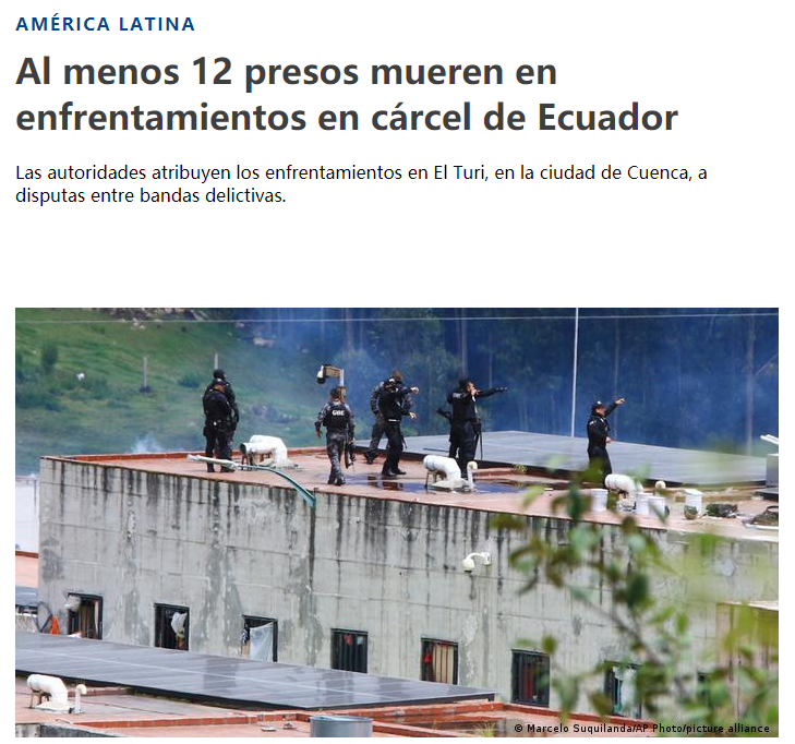 然而,这样严重的斗殴致死事件已经不是第一次了。据报道,此次在Santo Domingo这一监狱的事件是该地自今年5月以来的第二起,当时有44人死亡和10人受伤。实际上,从两年前开始,厄瓜多尔各地的监狱都时不时出现类似情况,而且伤亡人数高得令人震惊。El 28 de septiembre de 2021 se produjo la mayor masacre carcelaria en la historia del país, en la Penitenciaría del Litoral, en la ciudad de Guayaquil (suroeste), en la que fueron asesinados 119 reclusos y otros 80 quedaron heridos.该国历史上最严重的一起监狱屠杀事件发生在2021年的9月28日,地点在瓜亚基尔市 (Guayaquil,西南部城市)的Penitenciaría del Litoral监狱,当时有119人被杀,另有80人受伤。