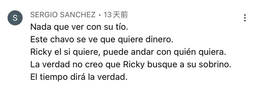 当然大部分人还是觉得Ricky Martin是冤大头,外甥只是想得到好处罢了:“跟他舅舅无关,这小子只想要钱,Ricky如果想,他找谁都行,我不信他会找自己的外甥。时间会证明一切的。”