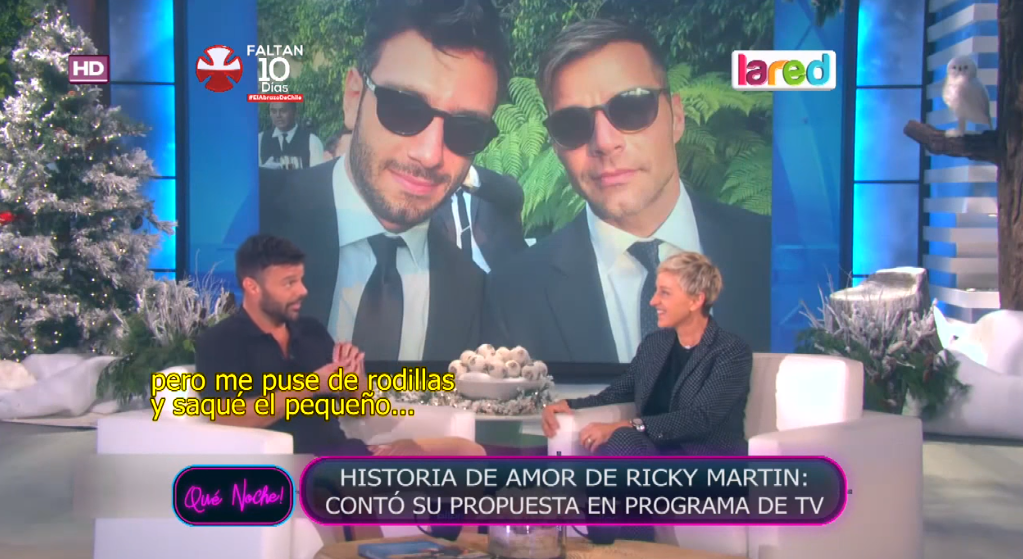 在一起两年后的2016年,Ricky Martin正式向对方求婚了。“Estaba muy nervioso, pero me arrodillé y saqué la cajita de metal, que estaba dentro de una bolsita de terciopelo. En vez de decir ‘quieres casarte conmigo’ dije ‘¡tengo algo para ti!'”, recordó emocionado Ricky en su entrevista con la presentadora.“我当时很紧张,但还是跪了下来并拿出一个小金属盒子,里面是一个绒布的小袋子。我当时应该没说‘你想和我结婚吗’,我说的是‘我有个东西要给你!’”Ricky在接受记者采访时激动地回忆说。