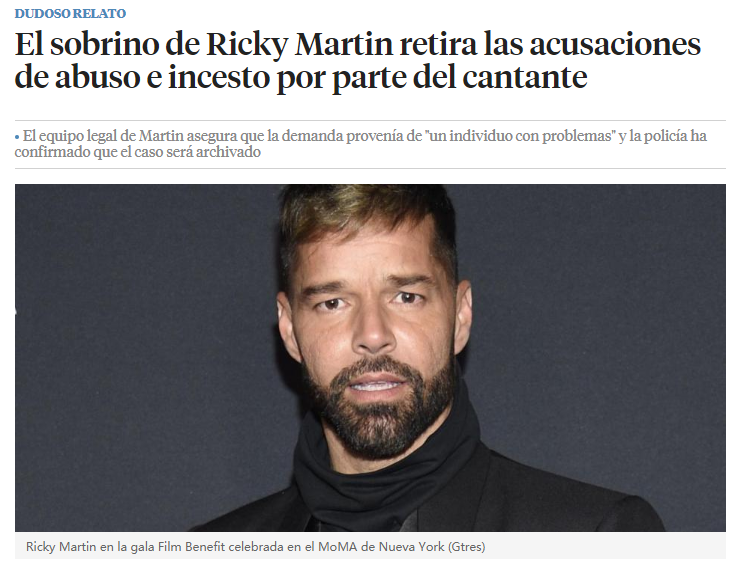 在当下这个消息飞速流通的时代,追星的“风险”也越来越大——无论是多知名的大咖,没准哪天就被曝出丑闻,瞬间“塌房”。而最近,世界知名歌手瑞奇·马丁(Ricky Martin)就深陷一场官司泥潭:7月初,他突然遭到自己21岁的外甥指控家庭暴力(violencia doméstica),并称两人有过7个月的交往关系(una relación de siete meses)。消息一经传出,所有人都震惊了。