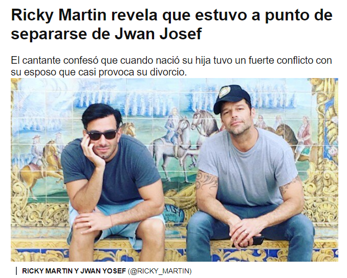 两人结婚后一直非常恩爱,也被奉为圈内的“模范夫夫”。然而近几年也有消息称,这位拉丁天王的婚姻生活遭遇了危机。El cantante boricua Ricky Martin confesó haber atravesado una fuerte crisis matrimonial con su esposo, el pintor sirio Jwan Yosef, después del nacimiento de la única hija de la pareja.波多黎各歌手Ricky Martin坦白说,在他们唯一的女儿出生之后,他和老公——画家Jwan Yosef经历了一场严重的婚姻危机。