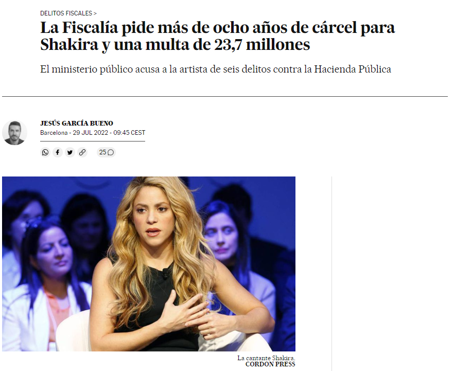 https://co.marca.com/claro/trending/2022/08/03/62e9aa27e2704e020c8b45b6.htmlhttps://elpais.com/economia/2022-07-29/la-fiscalia-pide-mas-de-ocho-anos-de-carcel-para-shakira-y-una-multa-de-23-millones.html声明:双语文章中,中文翻译仅代表译者个人观点,仅供参考。如有不妥之处,欢迎指正。未经允许,请勿转载